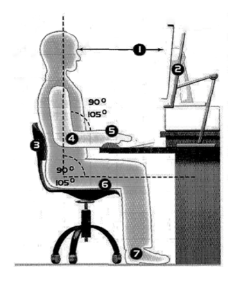 A Computer ergonomics There are a number of health and safety problems that may result from continuous use of computers. • Typing constantly at high speed may provoke repetitive strain injury or RSI, which causes pain in the neck, arms, wrists, hands and fingers. • Bad work postures and sitting in uncomfortable chairs may cause backache and stress. • Looking at the screen for long periods of time, and lights reflecting off the screen, can cause headaches and eye strain eye strain, pain and fatigue of the eyes. The study of how people interact safety and efficiently with machines and their work conditions is called ergonomics. In computing, ergonomics is about designing computer facilities so they are safe and comfortable. Here are a few tips. 1. Get an adjustable chair so you can change its height and angle. 2. Make sure your feet rest firmly on the ground or on a foot rest. 3. Ensure you have enough leg room under the desk. 4. Put the monitor at eye level or just below. 5. Sit at arms’ length from the monitor (40-80 cm). Don’t sit near the sides or back of CRT monitors; or use LCD screens, which are free from radiation. 6. Use a document holder, in line with the screen, to reduce awkward neck and eye movement between the document and the screen. 7. Position the keyboard at the same height as your elbows, with your arms parallel to the work surface. Try to keep your wrists straight and flat when typing. 8. Take regular breaks from the computer and look away from the screen at regular intervals.